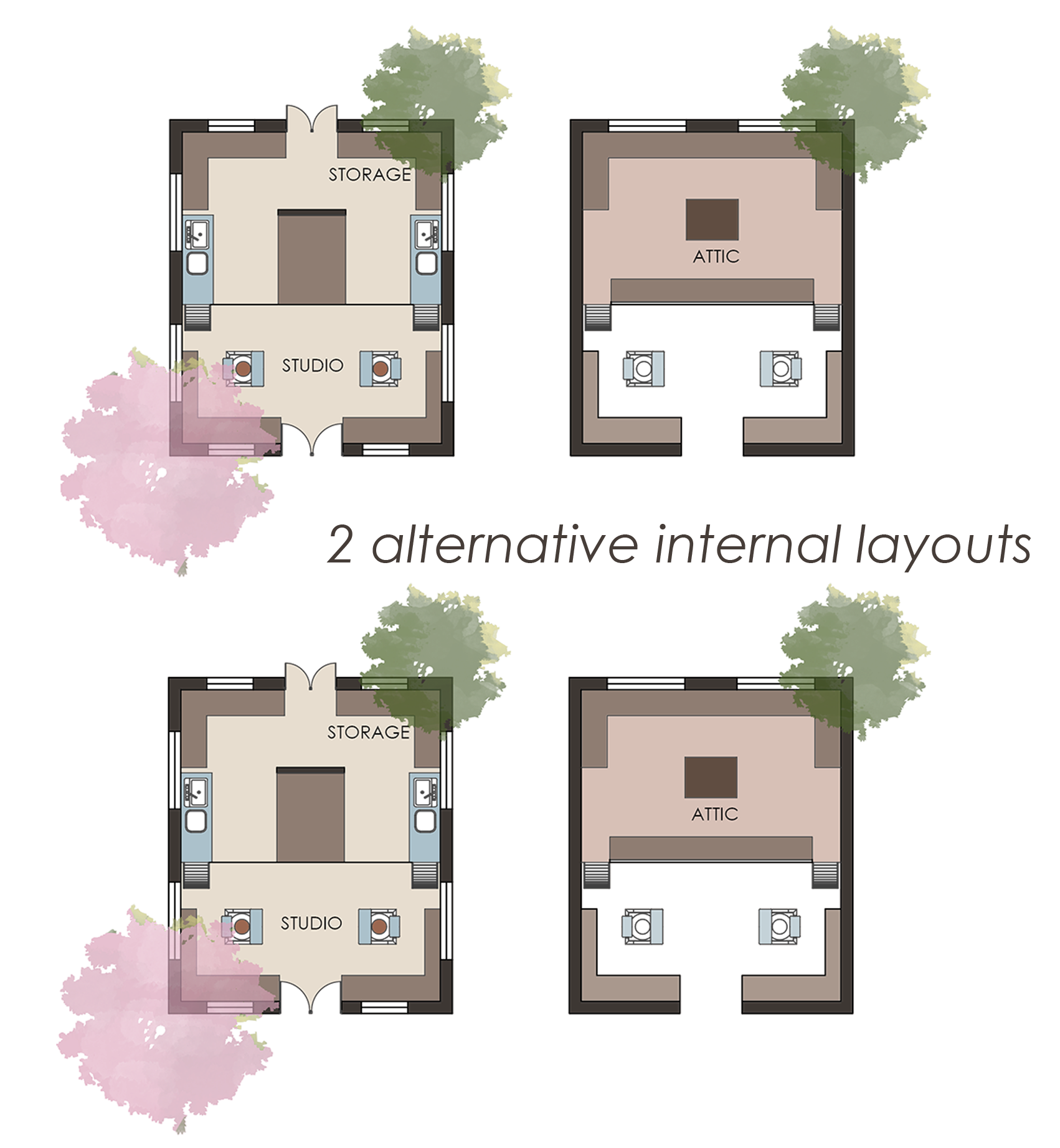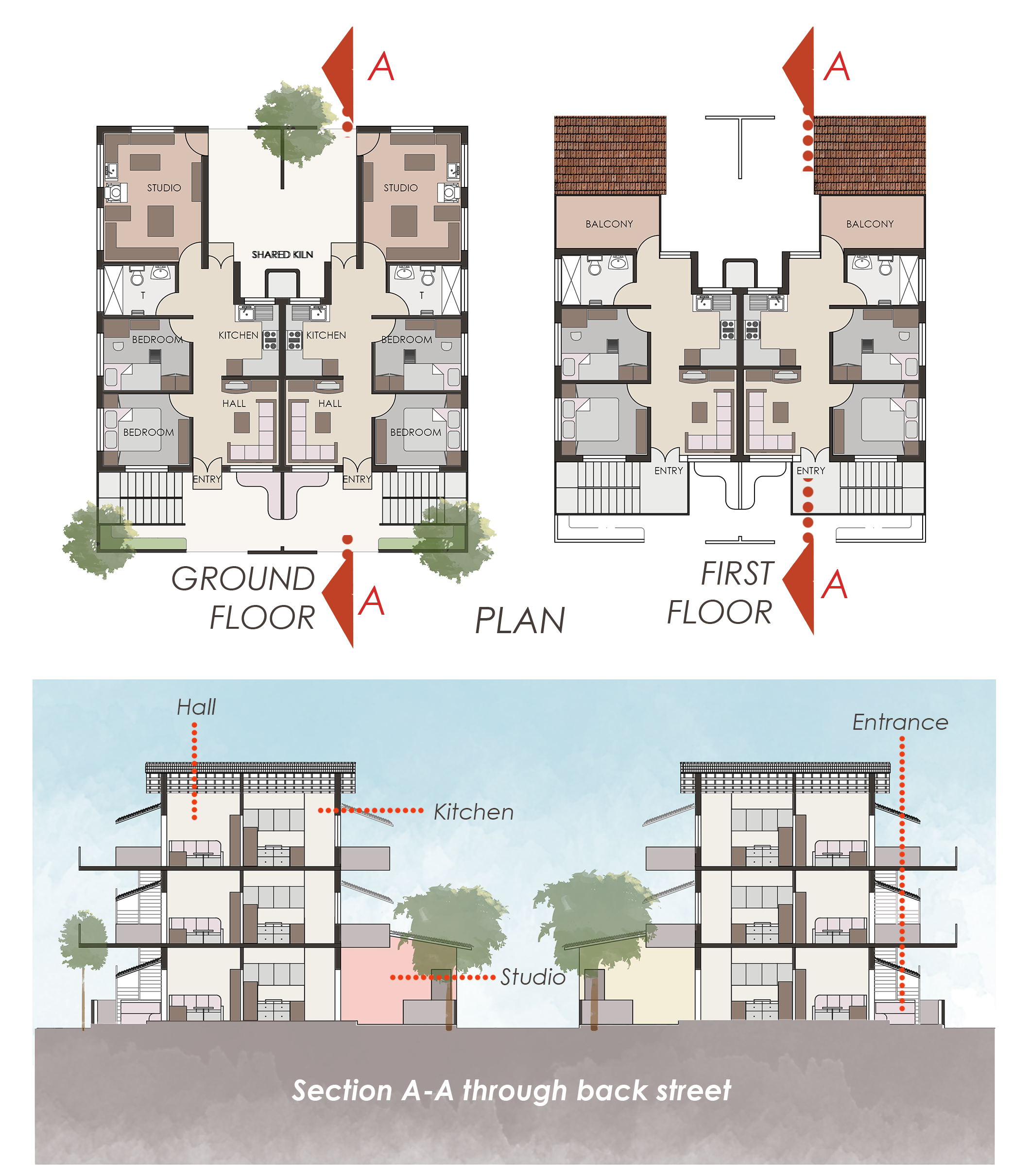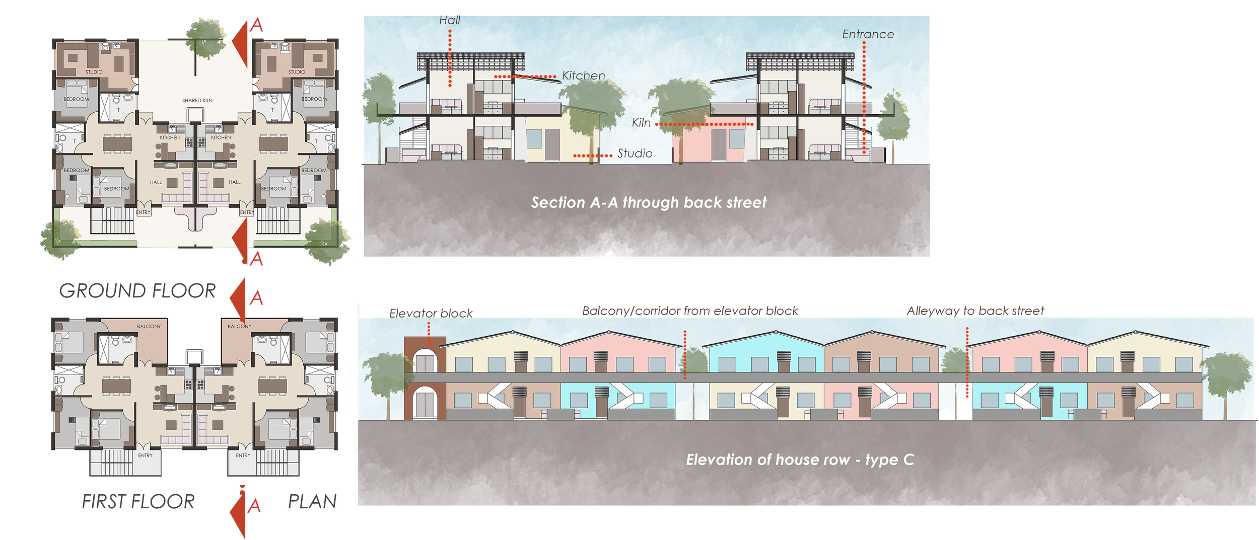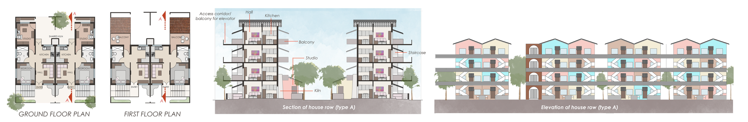 The ground floor modules have an attached potter’s studio- houses for potters.
