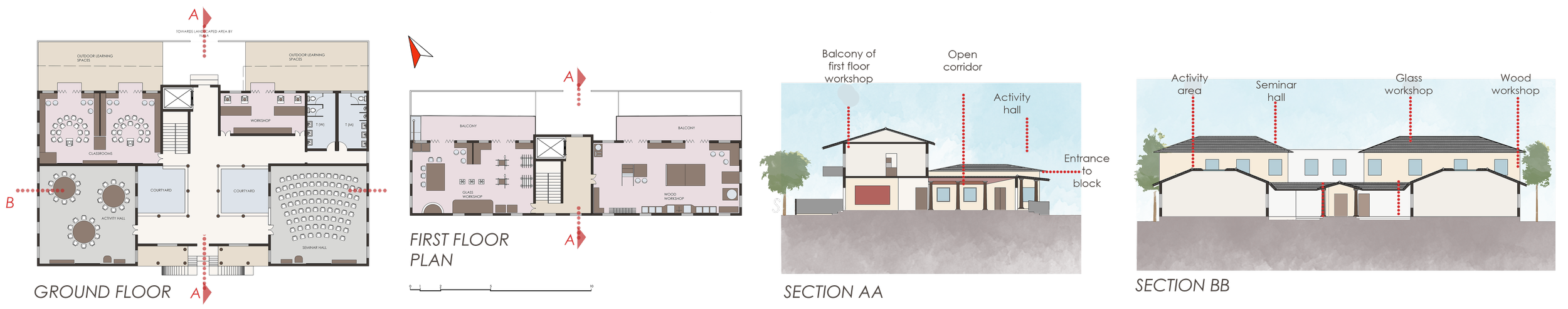 Includes classrooms, studios, glass and wood workshop and seminar/activity halls, for formal training and lectures/demonstrations, by potters from various parts of the country for the potter community of Pottery Town, as well as students. It has been planned using the courtyard concept, as well as the verandah concept, with a thinnai or seating platform in the verandah.