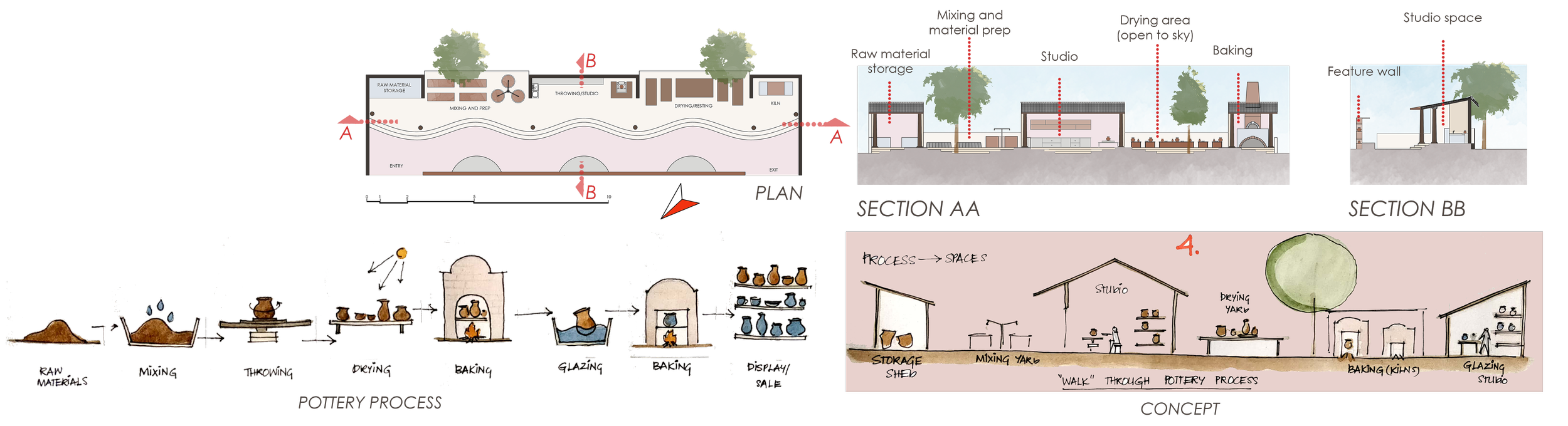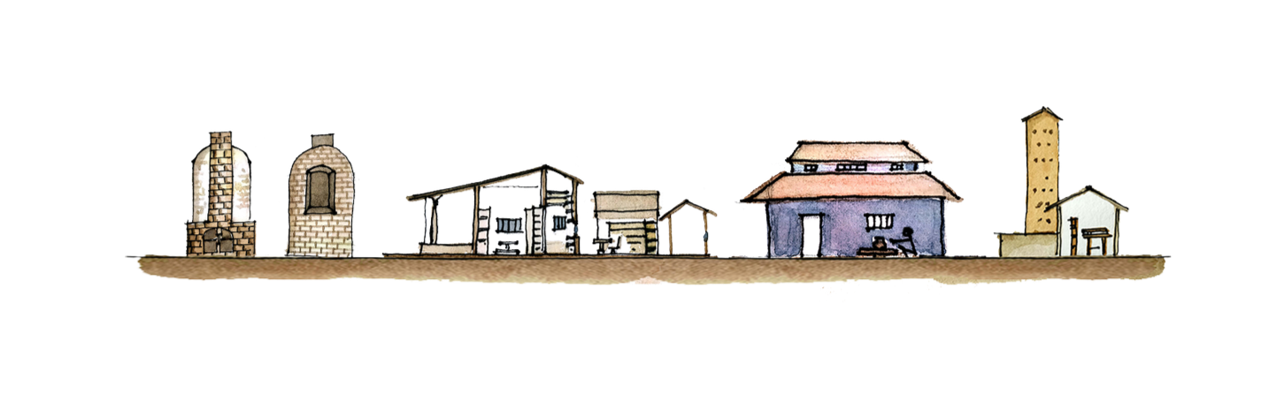 Planned around a central court, which is also used as a drying area by the two blocks facing it. Spaces are sequentially arranged, according to the pottery process (materials > throwing > baking).
