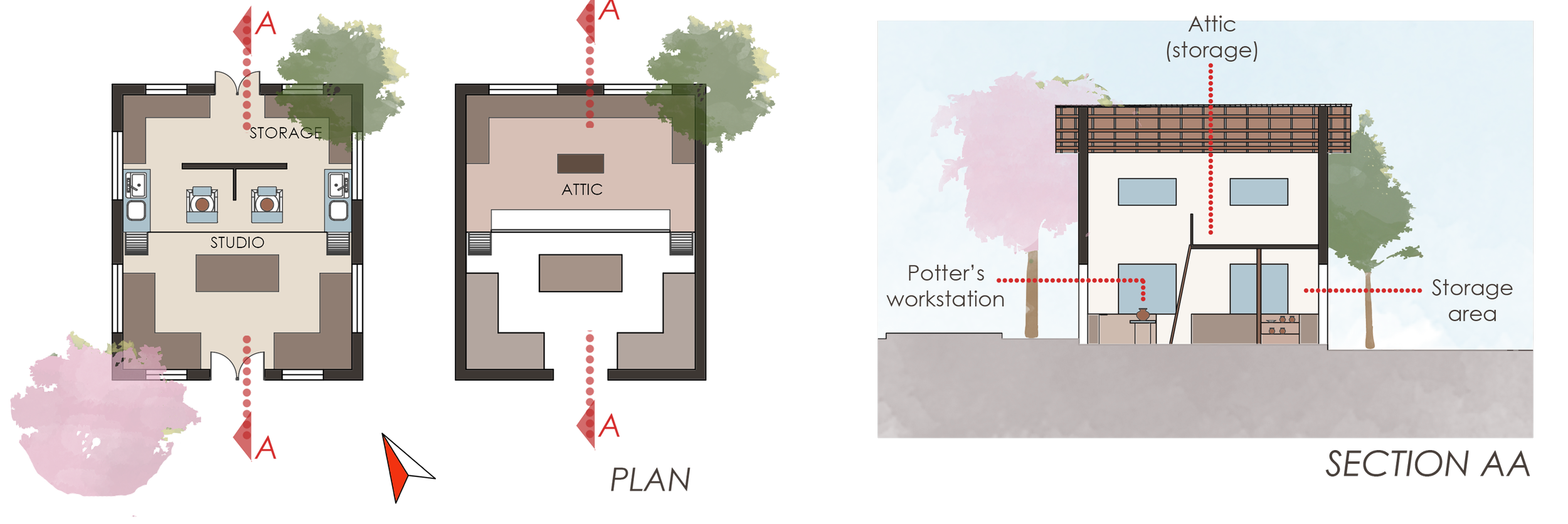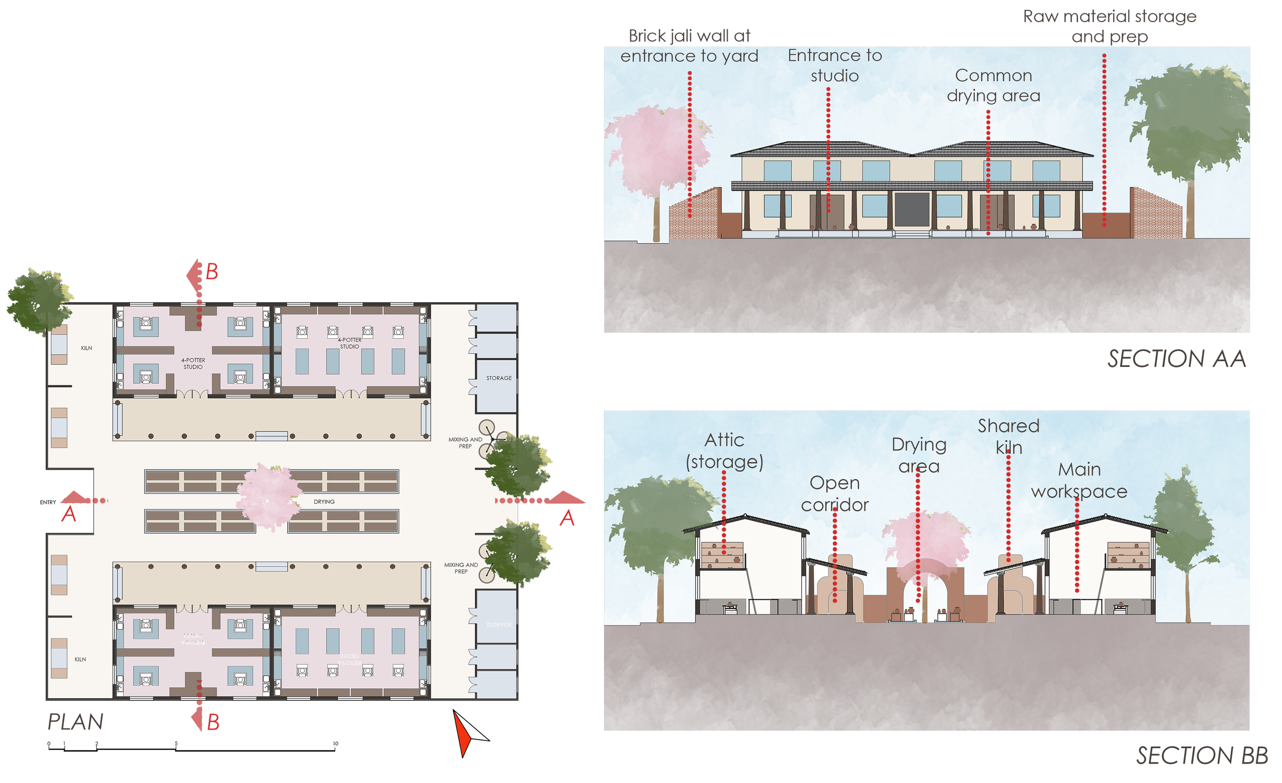 Each block has two workshops, accommodating four potters each. Design cues were taken from existing potters’ workshops, like an attic accessed using ladders, for storage.