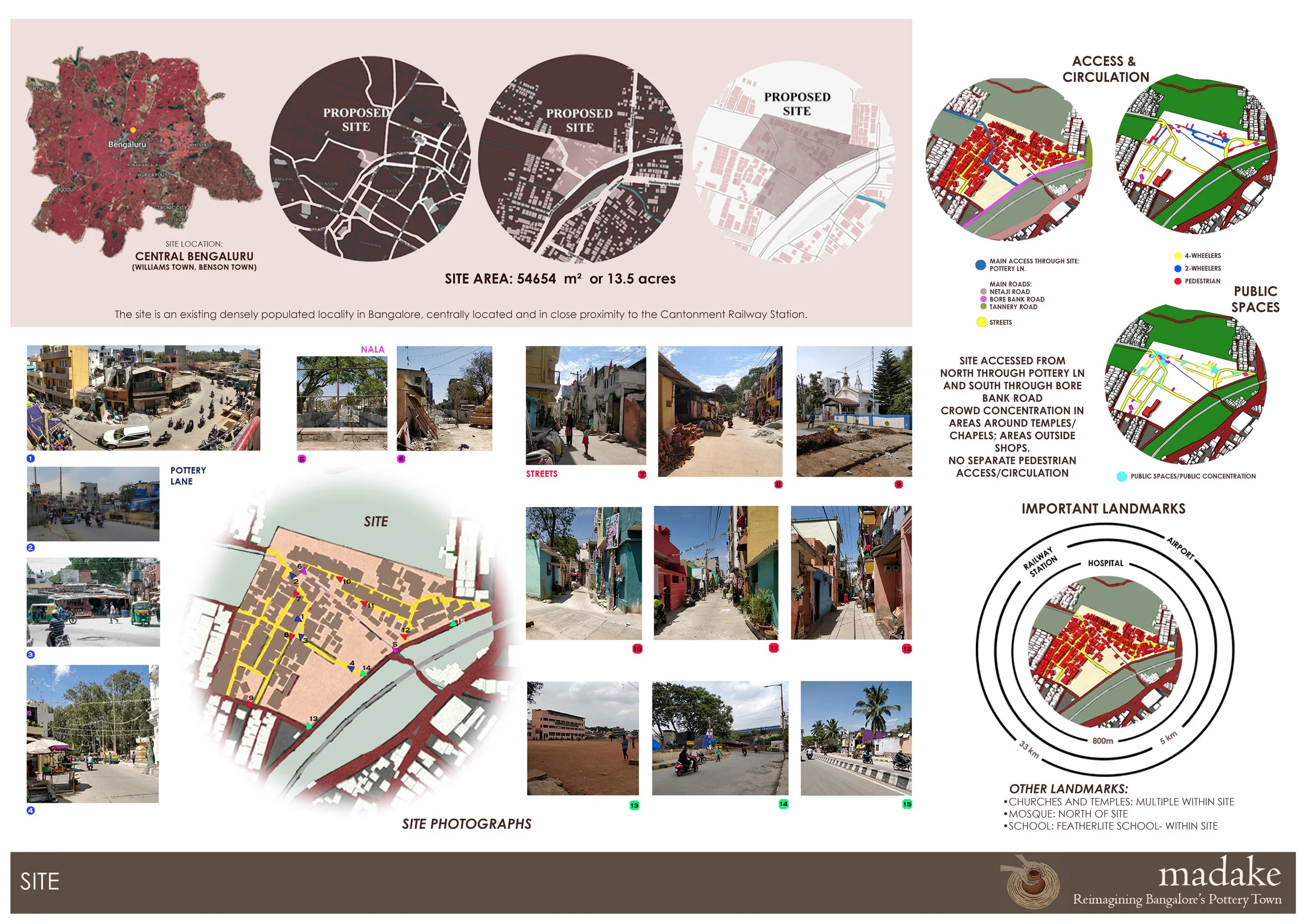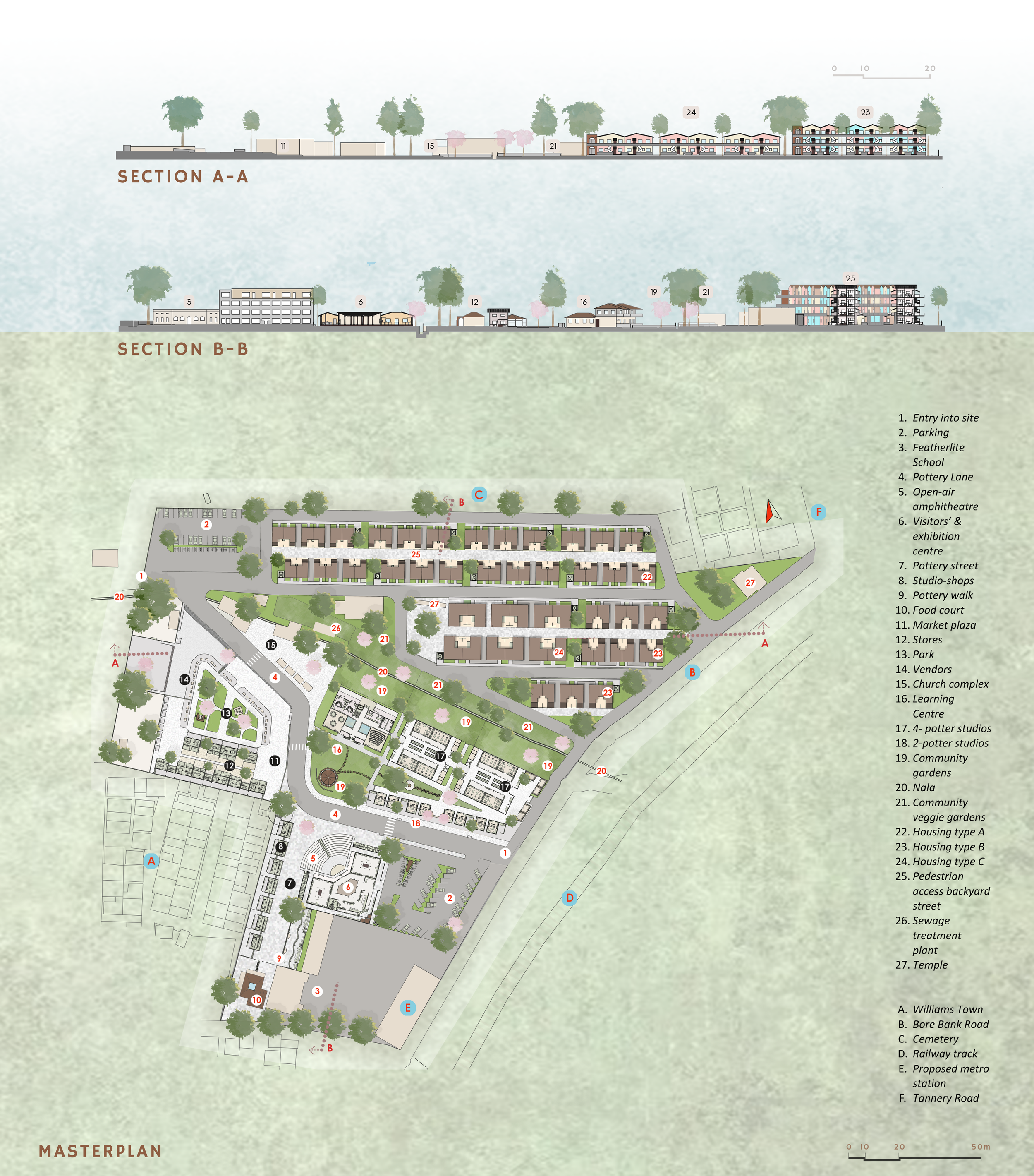 Pottery Town, established in the early 1900s to serve the Mysore royal family’s need for terracotta ware, remains one of Bengaluru’s few surviving craft-based neighbourhoods. Over the years, its once cohesive community of potters has dispersed, and the settlement now faces issues of congestion, poor sanitation and deteriorating living and working conditions. This design thesis reimagines Pottery Town as a revived urban craft precinct, one that strengthens livelihoods, improves housing and infrastructure, and preserves its cultural vibrancy. Drawing from site analysis, demographic surveys, existing spatial patterns and case studies, the design proposes sensitive reorganisation rather than replacement or displacement, balancing new housing, markets and shared studios, while maintaining the neighbourhood’s organic fabric & sense of place.