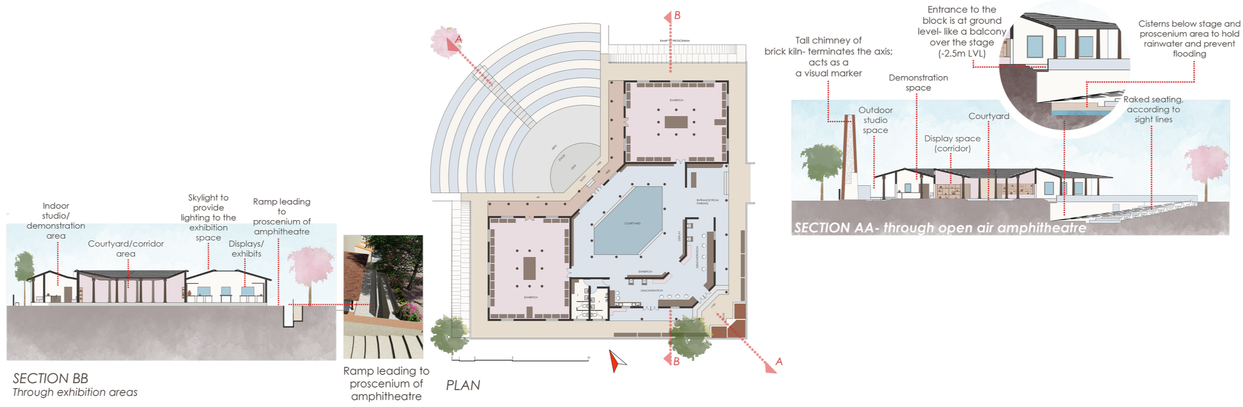 The entrance to the exhibition/visitors’ centre is through an open-air amphitheatre that begins at ground level and gradually steps down such that the stage is directly beneath the front façade of the block (like a balcony). Entry into the block is along the sides of the amphitheatre. Designed based on a visual axis, derived from the sequential door feature found in traditional south Indian homes, as well as the courtyard concept.