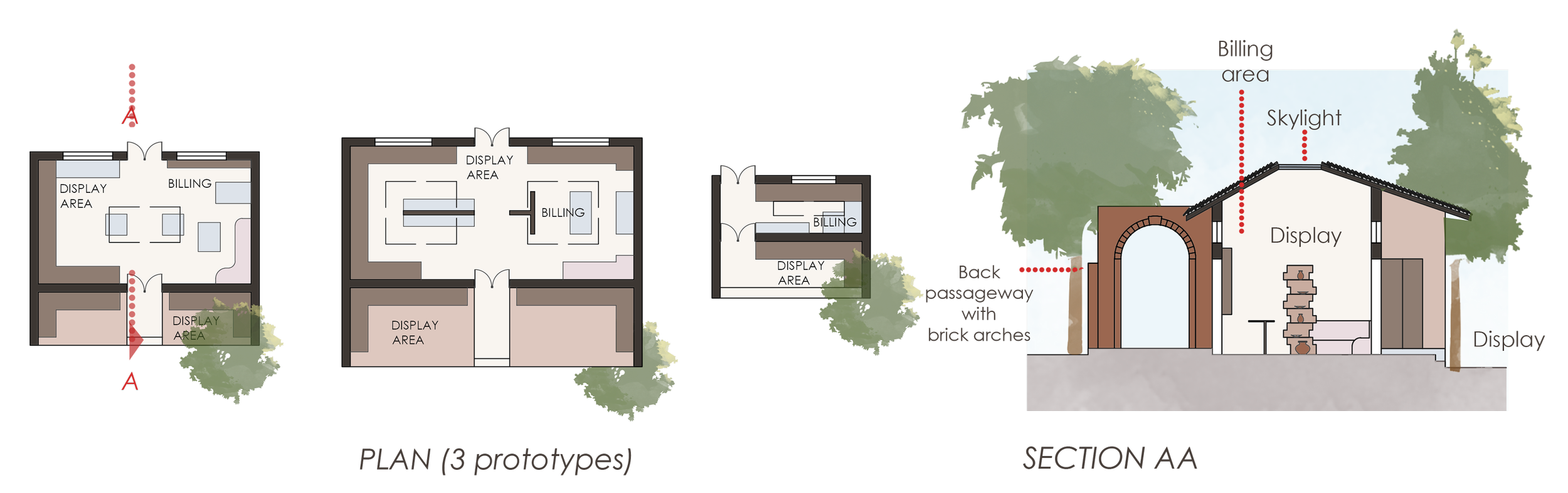 Space allocated for shops; prototype designed as a representation. The plaza gradually increases in level through the use of steps, according to the slope of the site. Thus, the walk along the shops is a gradual incline with steps as well as a ramp. Shops have access from the front (for shoppers) and from the back (for potters/shopkeepers). Skylights provide natural light to the interiors. The rear of the shops is linked by an arched alleyway, allowing shade cloths to be stretched across on sunny days for protection from the southern sun.