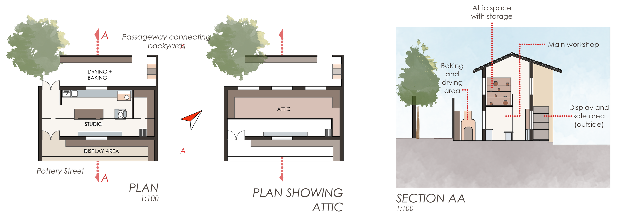 Single-potter studios/workshops with sale areas in the same space, the architecture and system following the existing Pottery Town workshop-shop pattern. This zone also includes old restored workshops.